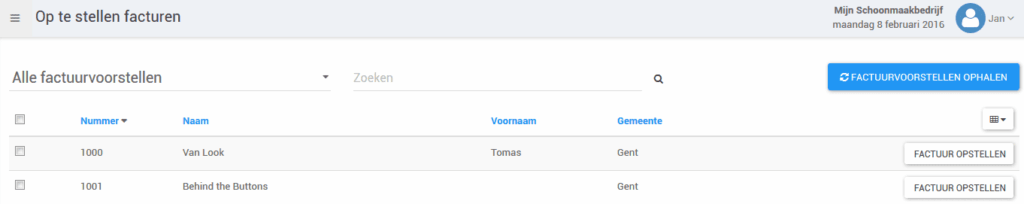 Buttons for Cleaners’ software easily prepares invoice proposals for you. If you approve the invoice, our software collects everything to create a detailed invoice. Think of execution address, execution date, description, unit and unit price. And do you work with an accounting package? We have a link to the most common packages such as Exact and WinBooks.Â