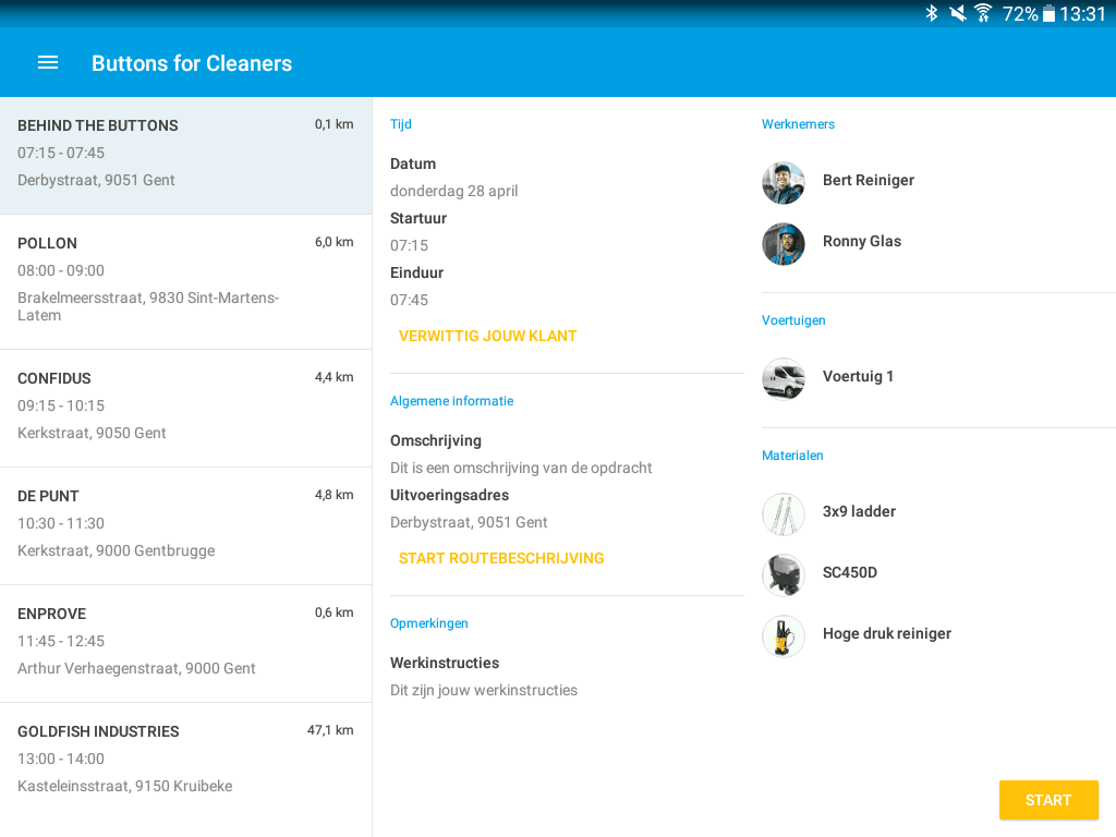 Our software lets users register different types of jobs, such as one-time, recurring or on-call jobs in one click! We offer flexibility in scheduling assignments with various options. Be it for groups of performers, planning per week, daily planning, 3-day planning, planning in list, weekly planning, with ButtonsforCleaners’ software you keep an overview! Easily make adjustments to your planning. See immediately when jobs have been completed or when a contractor is on vacation.